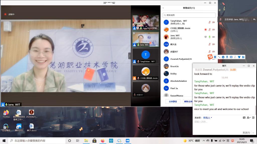 我校以习近平总书记对职业教育工作的重要指示为指导,根据教育部等八部门关于加快和扩大新时代教育对外开放的意见,结合我校“双高”建设、提质培优建设和“十四五”规划工作内容,克服时间紧、任务重的困难,精心设计和制作了学校虚拟展位、学校英文宣传图册和英文宣传视频等线上展所需材料,对宣讲教师反复进行培训,并针对互动环节可能被问到的题目进行了充分准备。在一个半小时的直播洽谈活动中,围绕“学校特色与专业建设”、“国际教育特色做法”、“国际交流与合作成果”三大内核,全面展示我校教育理念和设施,凸显我校办学特色,向世界展现芜湖职业技术学院的办学风采,吸引了多位外国院校代表观展。在互动环节他们更是频频提问,对我校国际合作、留学芜职等品牌项目给予高度关注并期待与我校下一步的合作。