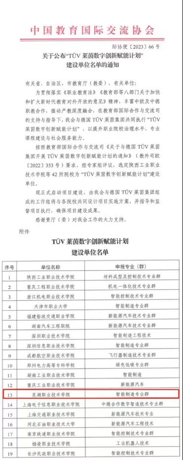 按照教育部国际合作与交流司《关于与德国TÜV莱茵集团开展TÜV莱茵数字创新赋能计划的通知》(教外司欧〔2022〕353号)工作要求,2022年12月,中国教育国际交流协会下发《关于开展“TÜV莱茵数字创新赋能计划”申报工作的通知》,并组织和开展该项目的申报和遴选工作。经过2022年12月至2023年2月3个月的组织申报和遴选,我校智能制造专业群在有关省(区、市)教育厅(委)推荐申报148个项目中,成功通过专家组评议和公示,顺利成为该计划42个建设单位之一。