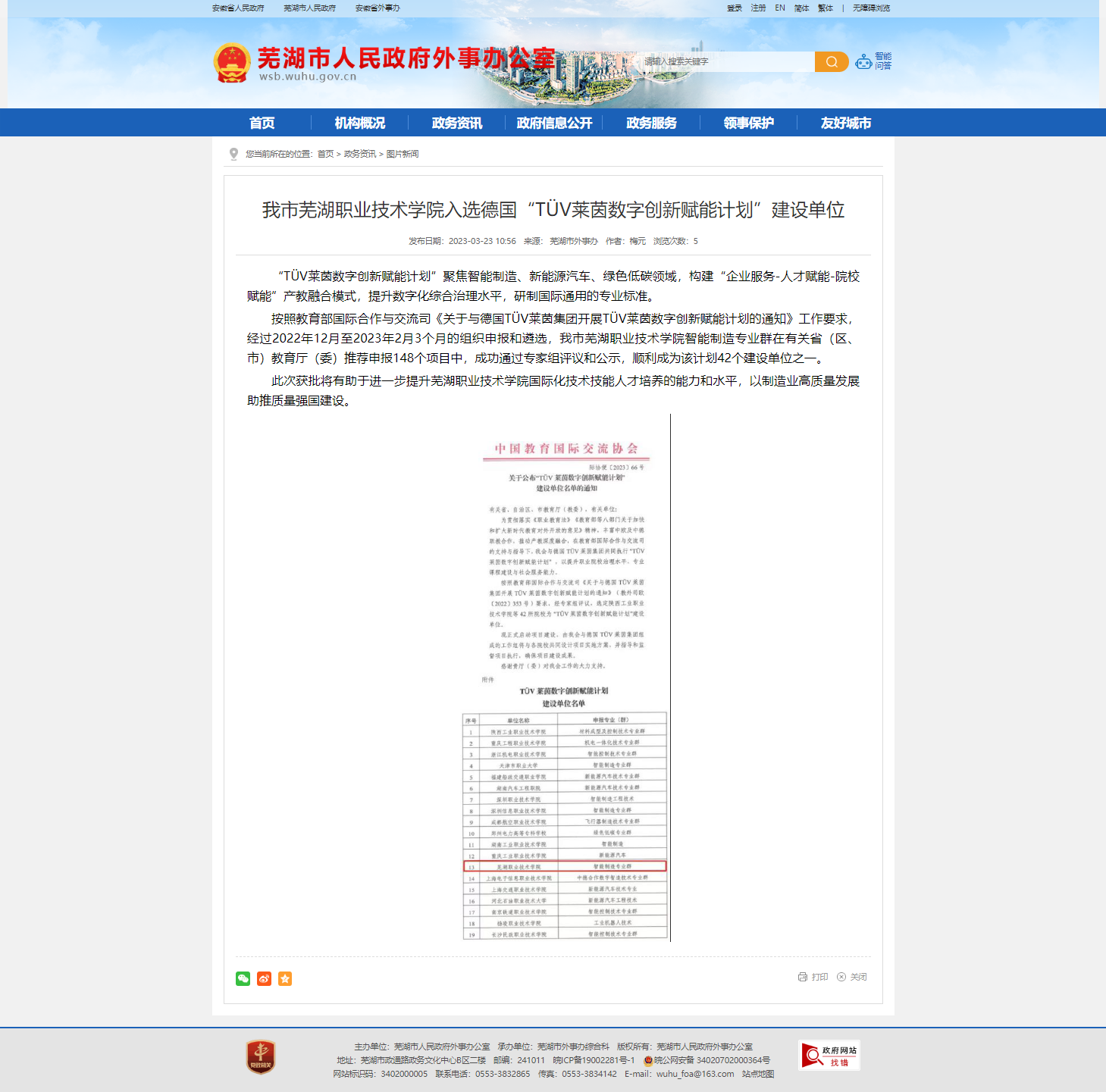 按照教育部国际合作与交流司《关于与德国TÜV莱茵集团开展TÜV莱茵数字创新赋能计划的通知》工作要求,经过2022年12月至2023年2月3个月的组织申报和遴选,我市芜湖职业技术学院智能制造专业群在有关省(区、市)教育厅(委)推荐申报148个项目中,成功通过专家组评议和公示,顺利成为该计划42个建设单位之一。