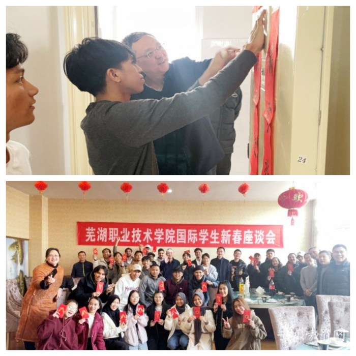 兔辞旧岁去,龙伴新春来。为让国际学生度过一个欢乐祥和的新春佳节,体验中国春节传统文化,感受到学院大家庭的温暖和关爱,2月9日,芜湖职业技术学院举办国际学生龙年新春座谈会。党委副书记、院长高武,教务处、国际教育管理学院、总务处、保卫处、学生处、智能制造工程学院、网络工程学院、国际经贸学院等单位负责人及相关管理人员与全体留校国际学生欢聚一堂,喜辞旧岁,笑迎新春。