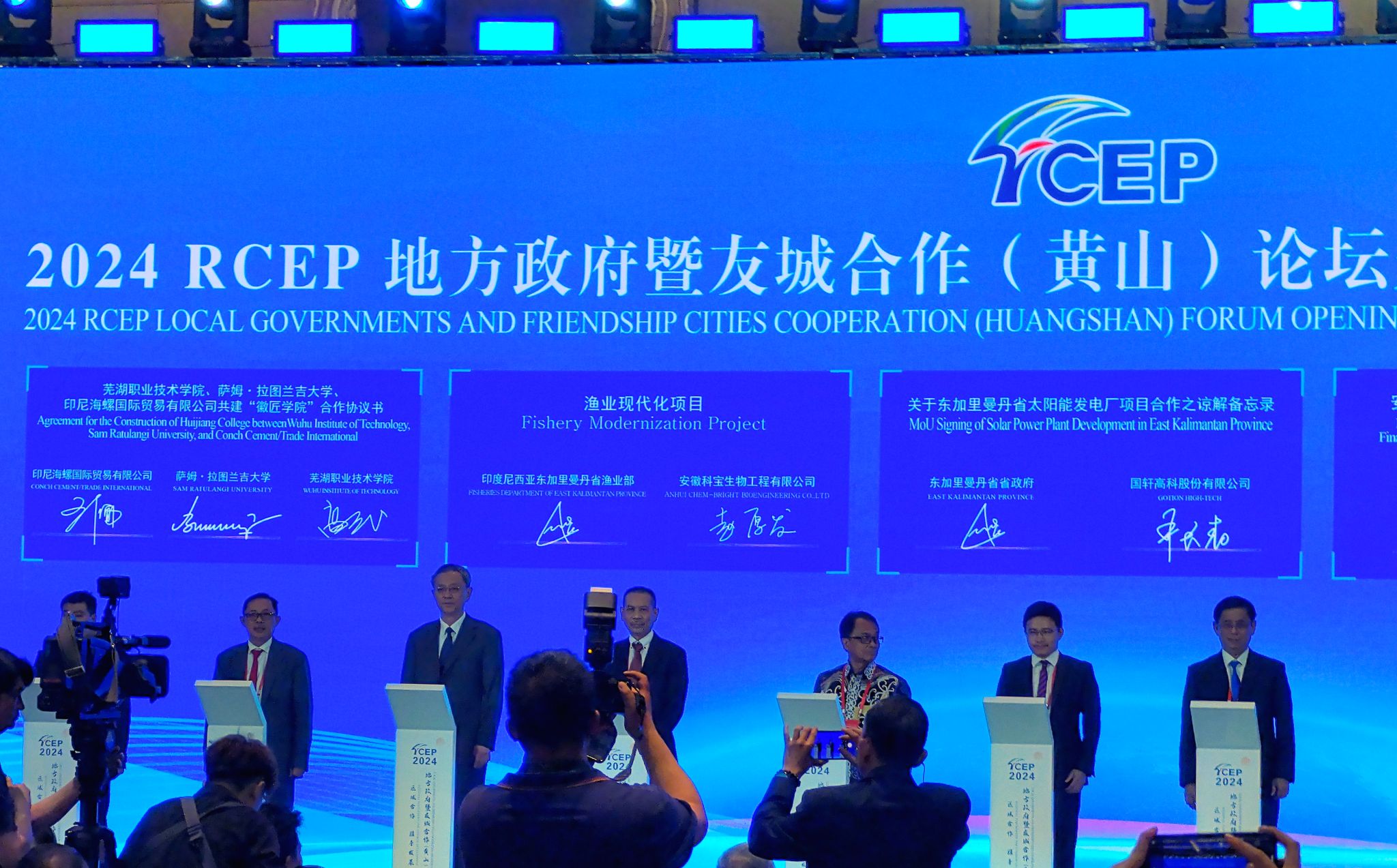 开幕式由省委副书记、省长王清宪主持,安徽省委书记、省人大常委会主任韩俊等相关负责人分别致辞。我校与印尼萨姆·拉图兰吉大学、印尼海螺国际贸易有限公司签订共建“徽匠学院”合作协议作为安徽省RCEP职业教育合作成果之一,在论坛开幕式经贸人文项目签约环节成功签约。