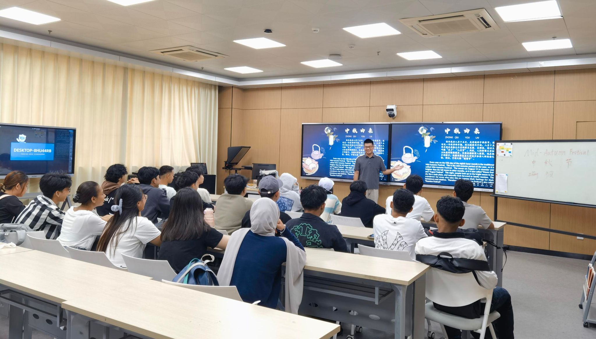 在文化讲座中,国际教育管理学院教师许蔚从嫦娥奔月、玉兔捣药等美丽神话传说入手,深入浅出地讲解了中秋节的历史渊源、赏月、吃月饼等传统习俗的文化内涵,以及“月圆人团圆”这一核心情感价值。国际学生们听得津津有味,不时举手提问,与老师探讨更多的中秋节特色活动。